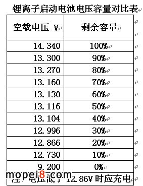 8. 问: 如何检测天丰牌摩托车启动锂电池的剩余容量百分比?