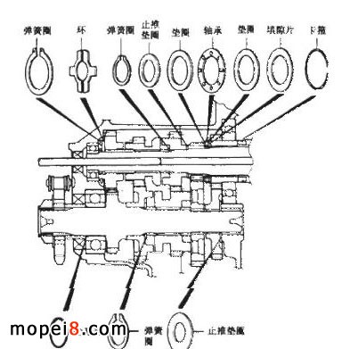 当变速器发生故障而解体后,在组装时应注意不要错装或漏装诸如轴用弹性挡圈、止推轴承、平垫圈、调节垫片及 O 型环等。下图给出了变速器主、副轴及各挡齿轮的安装位置,供维护变速器时参考。
