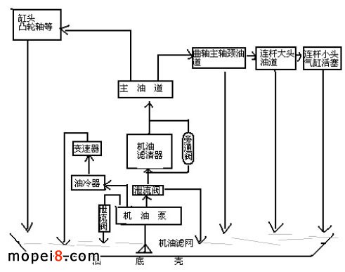 对于多缸四冲程轴瓦结构摩托车来说,由于曲轴与连杆使用的是高速轴承,而高速轴承对润滑油的供油压力与洁净度有严格要求,所以它们的润滑系统与一般普通小排量车不同。润滑系统如图所示。