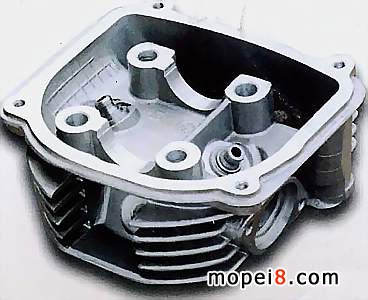 从外观上看,我们平时熟悉的火花塞、排气管就是安装在气缸头上的,化油器也是通过与气缸头之间的进气管,将可燃烧混和气被动输入到燃烧室。从内部看,汽缸头中固定有凸轮轴、气门摇臂、进排气门导管、油封、气门弹簧等。气缸头盖起到密封作用,与气缸头两者构成了安装配气机构的空间。所我们可以说,气缸头有两个功用:1、控制进气、排气。2、与气缸构成燃烧室。