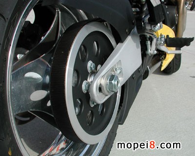可用三种基本方式将发动机功率传递给摩托车后轮:链条、皮带或轴。链条主减速器系统是目前最常用的方式。在此系统中,将安装在输出轴上的链轮(即变速器中的轴)连接到通过金属链附加在摩托车后轮的链轮上。变速器转动较小的前部链轮时,沿着链条将功率传递给更大的后部链轮,然后转动后轮。这类系统必须润滑和调整,且由于链条伸长和链轮磨损,还需定期更换。