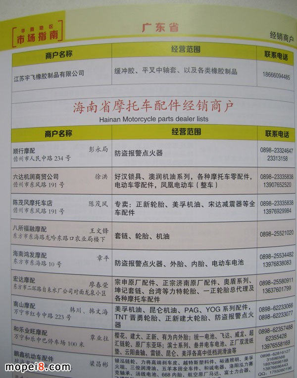 核心提示:《2015华南地区摩配市场指南》包含:广州市白云摩配市场、福星摩配城、松南摩配城、松北摩配城、中铧摩配城五个摩配市场及海南部份摩配经销商信息。订阅热线:400-633-6653