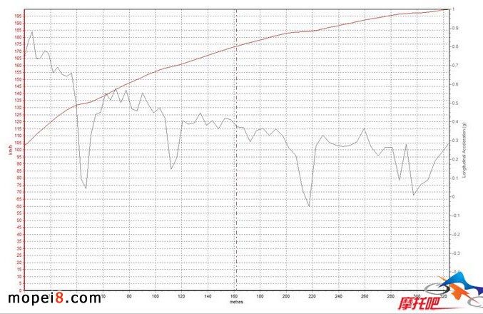 小丙以半离合器全油门冲出,加速力道立刻突破1G,在1.57秒后速度达到50km/h,此时可由曲线图看到因为前轮过度浮举,迫使我不得不回油,而略微影响了起步的加速成绩,使得3.95秒后才突破100km/h,这主要是因为Ninja 1000的油箱较大、车把较高,起步时较难像跑车使用前顷的姿势压制车头的缘故,但0-100km/h加速费时3.95秒依然不算太差。而在突破100km/h后打入二档,仍维持着0.7G左右的加速力道,突破160km/h时仅花费7.33秒,此时尚未通过跑道的一半,最终虽于390m处提前收油但已对测试成绩影响不大。如果您对0-400m 11.71sec这个数字并没有太大的概念的话,在此另外提供对照组,像是Mitsubishi Lancer Evo.Ⅹ或是Subaru Impreza STi这类标榜着道路版WRC赛车名号的战斗机器,0-400m加速不过是勉强进13秒台而已。