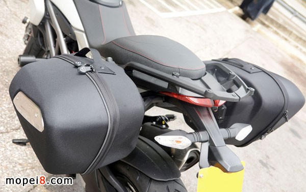巡航化后的Hyperstrada,性能依旧强猛,但个性圆润了,更适合双骑和中长途驾驶。最明显是升高了的把手和低座位,改变了整个驾驶姿势,把手和座位之间的距离也更接近,上身也更挺直。配合高风档,让人有一种陷入车身的感觉,不似motard版像坐在车顶油缸上的感觉。Strada版的头尾避震反应也比较柔韧,舒适性同步提高。原装跟车除了有一对可收纳full size头盔的侧袋之外,乘客扶手架也预留安装尾箱的扩充性机能。