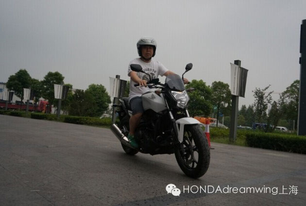 试驾体验车是一部珍珠白的NC750S DCT,骑上NC750S的第一印象是“轻”,但得益于NC车系的低重心设计,车子骑上去比一些公升级的纯跑还要轻盈。打开钥匙,全液晶的仪表上滚过自检 信息后,NC750的引擎已经蓄势待发。按下启动按钮,随着“滋”的一生轻响,并列双缸引擎已经开始运转。引擎声音保持了Honda的一贯风格,沉净而毫 无杂音,“咻咻”的声音中带有一丝V缸的韵味。摁下右手的变挡按钮,变速箱随之发出一下轻微的“啪嗒”声,液晶仪表上的挡位显示也从N挡变成D1。拧下油 门,引擎的声音略有增大,宽大的坐垫马上给屁股以强劲的推力,推动我向前冲去。