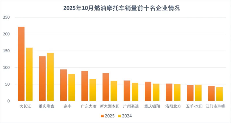 1-10月,燃油摩托车销量前十名企业(集团)为大长江、隆鑫、宗申、广东大冶、新大洲本田、广州豪进、重庆银翔、洛阳北方、五羊-本田、江门市珠峰,分别销售221.63万辆、133.75万辆、94.58万辆、89.96万辆、83.36万辆、61.36万辆、57.48万辆、52.06万辆、47.89万辆和44.74万辆。
