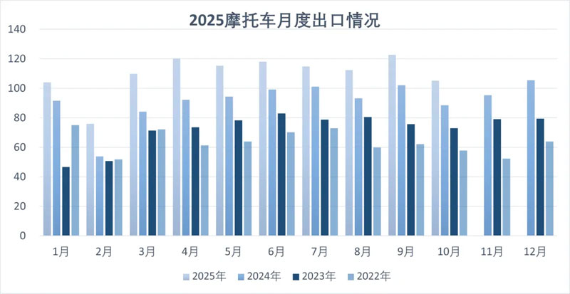 10 月,我国摩托车产销量呈现 “环比下降、同比增长” 的态势,外贸出口延续较高增长势头;从1-10 月整体表现来看,休闲娱乐类大排量摩托车市场持续保持高增长,外贸出口的强劲增长也对整个行业发展形成了显著的拉动作用。