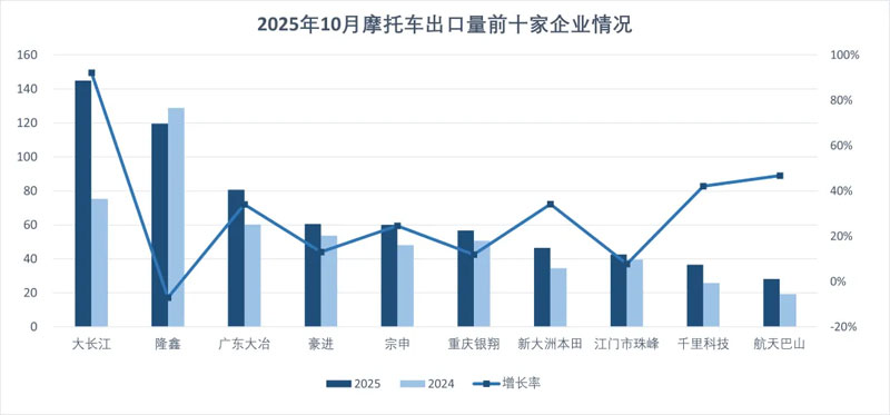 1-10月,摩托车出口量排名前十位的企业依次为:大长江、隆鑫、广东大冶、广州豪进、宗申、重庆银翔、新大洲本田、江门市珠峰、重庆千里科技、航天巴山,上述十家企业共出676.34万辆,占摩托车出口总量的61.38%。