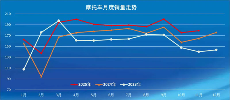 11月,全行业完成燃油摩托车产销152.96万辆和148.07万辆,环比增长5.68%和1.95%,同比增长9.61%和7.43%;电动摩托车产销31.69万辆和30.94万辆,产销量环比增长3.25%和2.73%,同比增长18.49%和14.98%。11月共产销摩托车184.65万辆和179.01万辆,产销量环比增长5.26%和2.08%,同比增长11.04%和8.67%;摩托车国内销售72.64万辆,环比增长3.39%,同比增长4.5%;燃油摩托车国内销售42.46万辆,环比增长4.78%,同比下降1.17%。其中二轮车产销160.21万辆和155.41万辆,产销量环比增长6.96%和3.57%,同比增长12.5%和10.4%。大排量休闲娱乐摩托车(排量250cc以上,不含250cc)产销6.73万辆和6.1万辆,产销量环比增长5.65%和0.16%,产销量同比增长10.33%和11.31%。三轮摩托车产销24.44万辆和23.6万辆,产销量环比下降4.67%和6.72%,产量同比增长2.32%,销量同比下降1.5%。