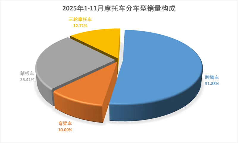 1-11月,跨骑车产销1041.54万辆和1038.91万辆,同比增长15.36%和15.46%;踏板车产销513.99万和508.86万辆,同比下降2.3%和4.36%;弯梁车产销200.77万辆和200.17万辆,同比增长28.77%和30.46%。从各车型销量占二轮车总销量的比重看,跨骑、踏板和弯梁三类车型占比分别为59.43%、29.11%和11.45%。
