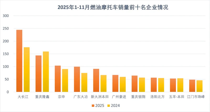 1-11月,燃油摩托车销量前十名企业(集团)为大长江、隆鑫、宗申、广东大冶、新大洲本田、广州豪进、重庆银翔、洛阳北方、五羊-本田、江门市珠峰,分别销售244.56万辆、143.99万辆、103.87万辆、99.65万辆、91.02万辆、67.22万辆、64.49万辆、56.49万辆、52.98万辆和48.41万辆。