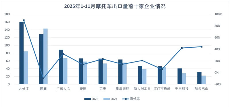 1-11月,摩托车出口量排名前十位的企业依次为:大长江、隆鑫、广东大冶、广州豪进、宗申、重庆银翔、新大洲本田、江门市珠峰、重庆千里科技、航天巴山,上述十家企业共出739.82万辆,占摩托车出口总量的61.23%。