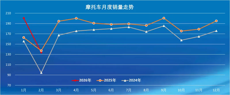 受春节假期因素影响,2 月摩托车行业产销较 1 月有所下降,外贸出口保持同比明显增长。1-2 月累计来看,在出口市场的强劲拉动下,行业产销实现稳步增长,外贸出口延续高增长态势,整体产业发展保持稳健运行。