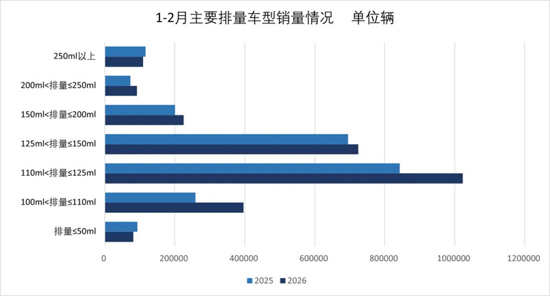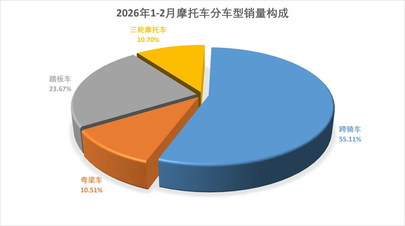 1-2月,跨骑车产销174.2万辆和184.03万辆,同比增长12.07%和16.19%;踏板车产销78.59万辆和79.03万辆,同比增长5.82%和4.13%;弯梁车产销32.22万辆和35.11万辆,同比增长14.02%和17.96%。从各车型销量占二轮车总销量的比重看,跨骑、踏板和弯梁三类车型占比分别为61.36%、26.35%和11.71%。