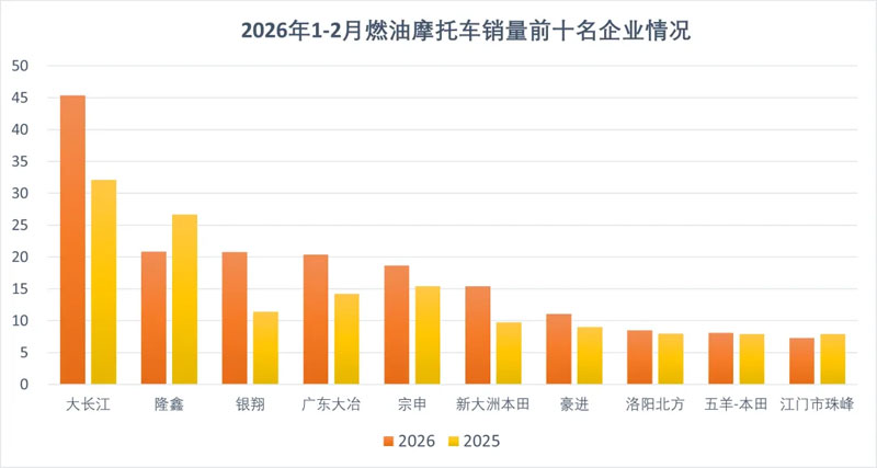 1-2月,燃油摩托车销量前10名企业(集团)为大长江、隆鑫、重庆银翔、广东大冶、宗申、新大洲本田、广州豪进、洛阳北方、五羊-本田、江门市珠峰,分别销售摩托车45.37万辆、20.81万辆、20.79万辆、20.36万辆、18.64万辆、15.38万辆、11.05万辆、8.47万辆、8.08万辆、7.3万辆,10家企业共销售摩托车176.25万辆,占摩托车总销量的59.89%。