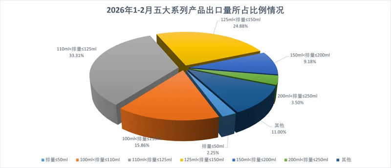 1-2月,出口量位居前六位的系列品种为:125系列、150系列、110系列、200系列、50系列和250系列,分别出口76.23万辆、56.94万辆、36.3万辆、21万辆、5.15万辆和8.02万辆。与去年同期相比,125系列同比增长33.18%,150系列同比增长7.36%,110系列增长72.18%,200系列增长13.63%,50系列下降26.61%,250系列增长36.43%。1-2月,上述六大系列品种共出口203.65万辆,占二轮摩托车出口总量的93.43%。三轮摩托车出口10.89万辆,同比增长24.04%。