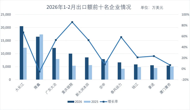 1-2月,摩托车出口金额排名前十位的企业依次为:大长江、隆鑫、广东大冶、重庆银翔、新大洲本田、宗申、春风动力、钱江、广州豪进、厦门厦杏,上述十家企业摩托车出口金额9.91亿美元,占摩托车出口总额的64.69%。