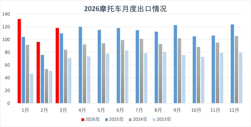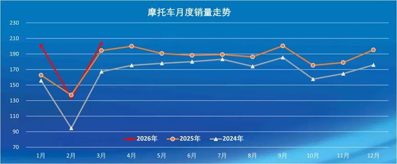 3月份,摩托车行业产销量同比、环比均实现显著增长,外贸出口维持高增速发展。一季度累计数据显示,在出口市场的强劲带动下,行业产销稳步提升,产业整体保持稳健发展态势。