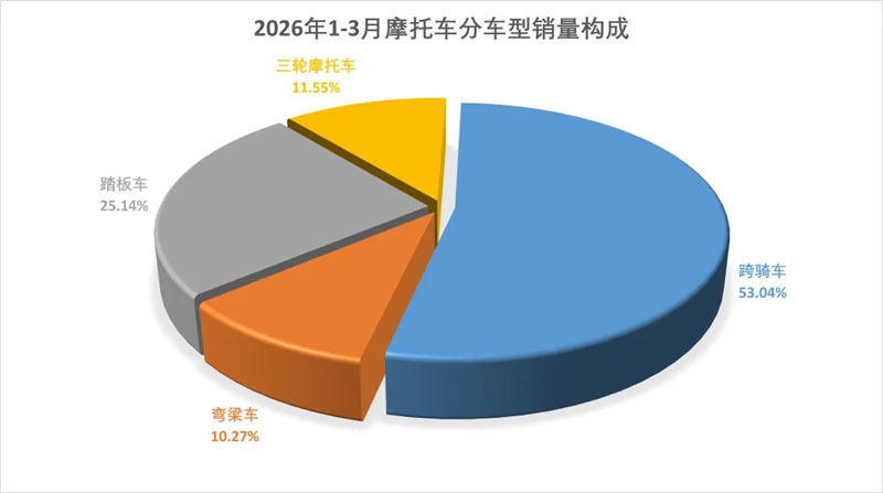 1-3月,跨骑车产销279.96万辆和284.97万辆,同比增长9.57%和11.52%;踏板车产销133.39万辆和135.09万辆,同比增长4.64%和5.58%;弯梁车产销54.63万辆和55.18万辆,同比增长18.01%和15.45%。从各车型销量占二轮车总销量的比重看,跨骑、踏板和弯梁三类车型占比分别为59.69%、28.29%和11.56%。