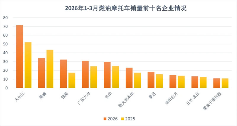 1-3月,燃油摩托车销量前10名企业(集团)为大长江、隆鑫、重庆银翔、广东大冶、宗申、新大洲本田、广州豪进、洛阳北方、五羊-本田、千里科技,分别销售摩托车71.59万辆、34.07万辆、32.3万辆、30.85万辆、29.8万辆、23.09万辆、18.35万辆、14.67万辆、13.33万辆、11.05万辆,10家企业共销售摩托车279.1万辆,占摩托车总销量的60.63%。