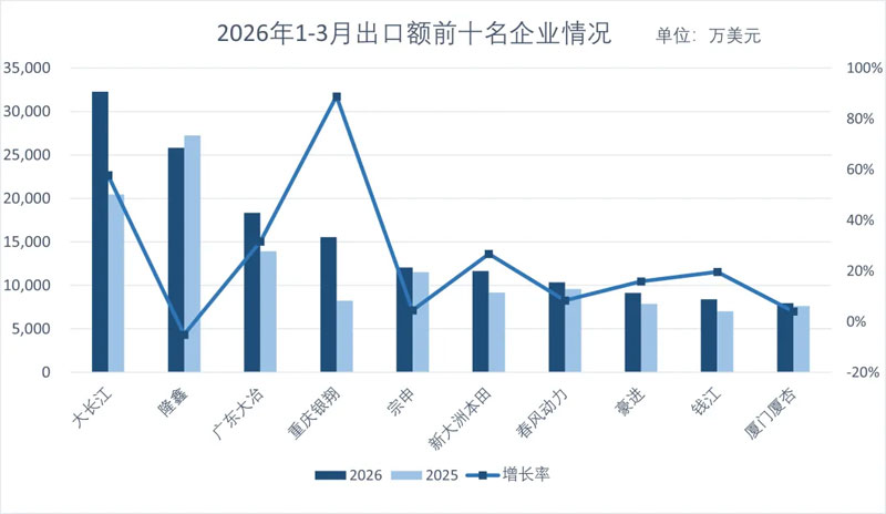 1-3月,摩托车出口金额排名前十位的企业依次为:大长江、隆鑫、广东大冶、重庆银翔、宗申、新大洲本田、春风动力、广州豪进、钱江、厦门厦杏,上述十家企业摩托车出口金额15.15亿美元,占摩托车出口总额的65.16%。