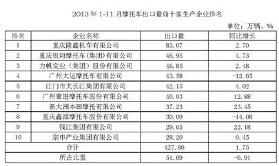 1-11月摩托车生产企业出口情况简析:摩托车企业产品出口总额53.73亿美元,同比增长2.68%。其中摩托车整车出口837.42万辆,同比增长2.70%,出口金额45.58亿美元,同比增长2.66%。