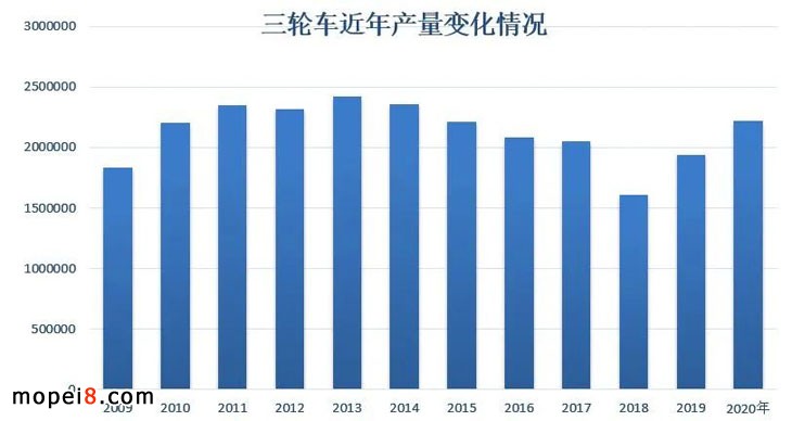 三轮摩托车虽然面临着环保达标的压力,但在农村有着很好的消费基础,符合农村老百姓的需求。经过了几年的调整,去年开始有所恢复。2020年,产销量约为222.3万辆,同比增长14.66%。其中,电动三轮摩托车销量为65.38万辆,同比增长62.05%;燃油三轮摩托车销量为156.63辆,同比增长2.15%。2020年,中小排量摩托车、电动摩托车、三轮摩托车共销售约1686.59万辆,占摩托车总产销量的98.8%。
