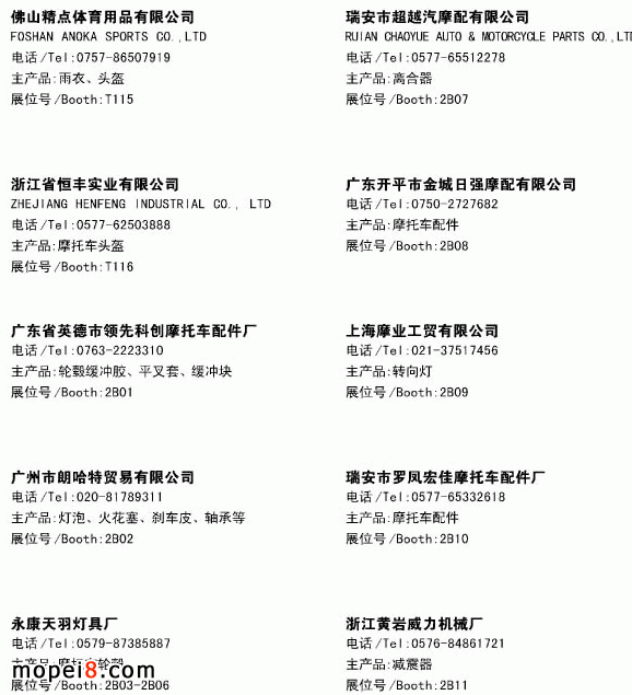 第三十三届(2013春)全国摩托车及配件展示交易会已于2013年4月25日在济南国际会展中心召开,2013春季全国摩配会已过去一个月了,仍有一些摩配同仁问到关于此次的展会情况及参展企业的信息,为方便需要了解此次展会信息的同仁,现将参展企业的主营产品及联系电话发布出来。