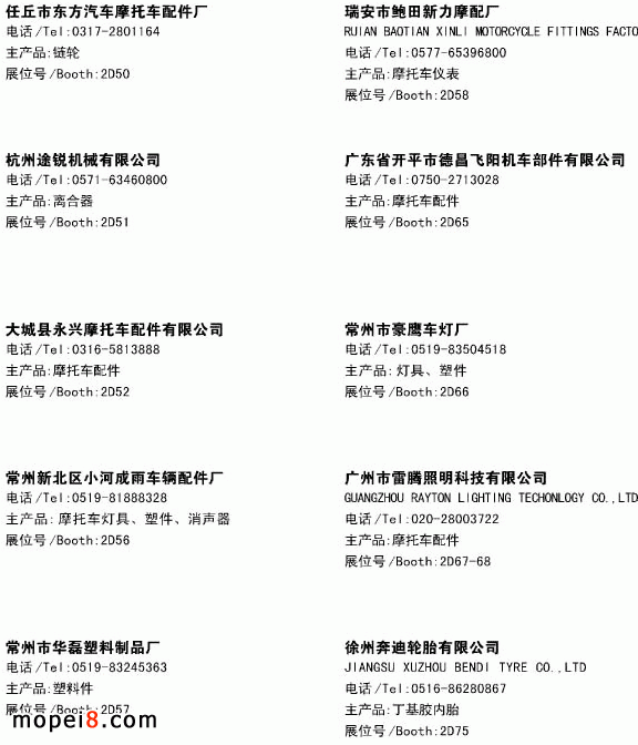 第三十三届(2013春)全国摩托车及配件展示交易会已于2013年4月25日在济南国际会展中心召开,2013春季全国摩配会已过去一个月了,仍有一些摩配同仁问到关于此次的展会情况及参展企业的信息,为方便需要了解此次展会信息的同仁,现将参展企业的主营产品及联系电话发布出来。