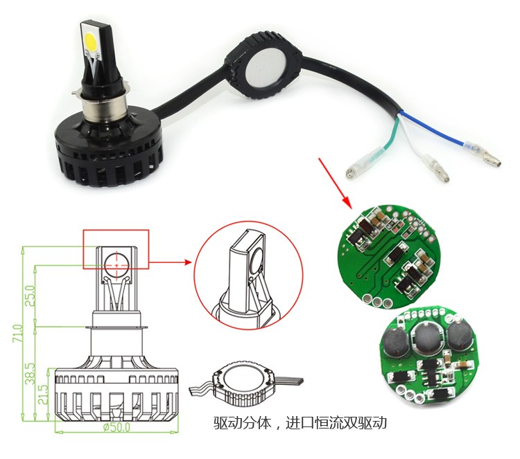 8.本灯为直流供电,用在直流摩托车或大灯端电压为12V的电动车上;如果是交流车,或者大灯端电压高于12V的电动车就不能用。